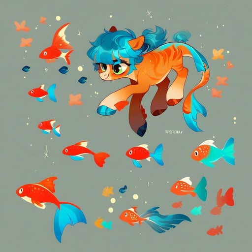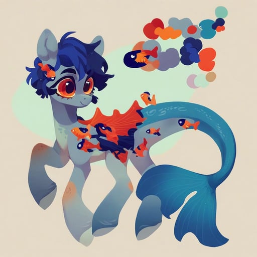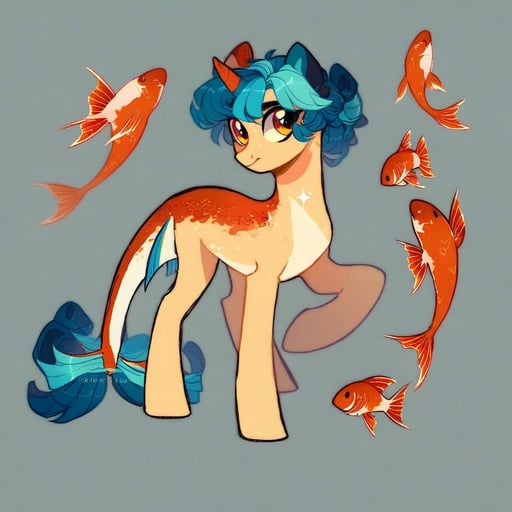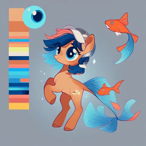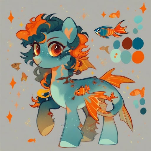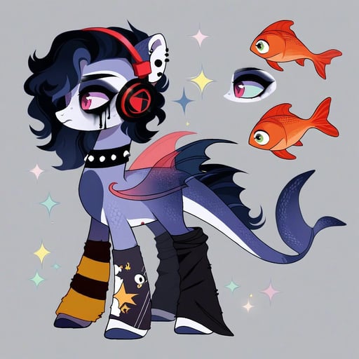 score_9, (rating_safe), my little pony style, 2d, base 2d, mlp 2d, white pony, coral-orange stockings on all legs, coral-orange mask around eyes, messy asymmetrical choppy mane and tail, neon blue hair with electric yellow streaks, gold hoop earring, pearl choker necklace, fishnet crop top, goldfish enamel pin dangling from tail, abstract matte black tuna stripe cutie mark, hooves wrapped in black electrical tape, small anchor tattoo on back