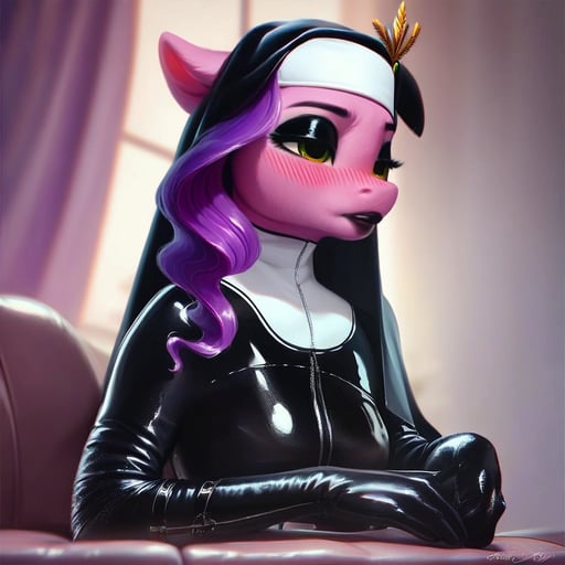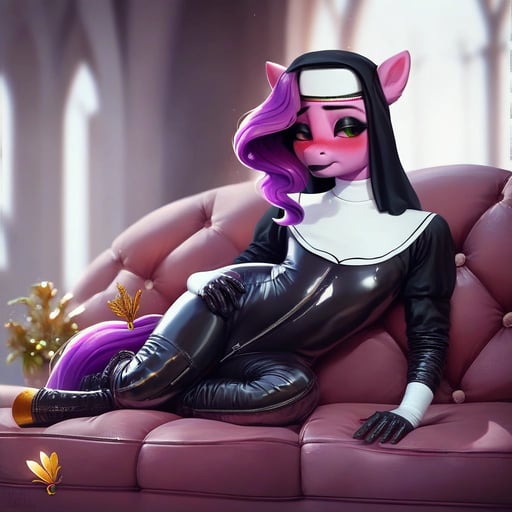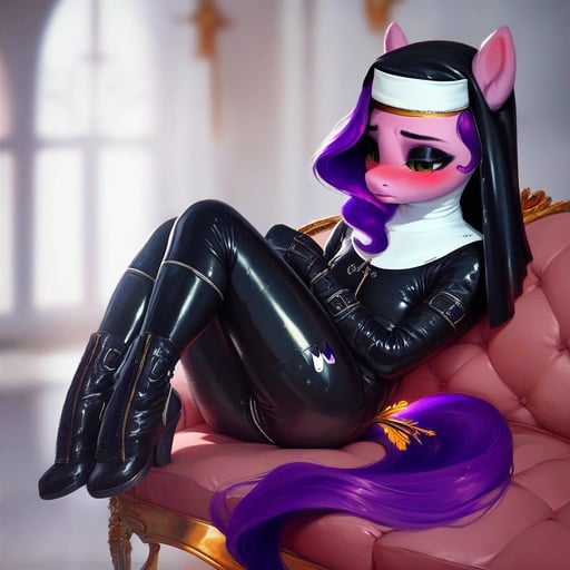 score_9, aesthetic 11, realistic,((((anthro pony)))),lidded eyes, (((black eyeshadow))),glossy lips, masterpiece, beautiful, detailed,(((applebloom))),(((blush))),solo, shiny chunky goth zipper boots,((( shrug (((latex nun))) robe))),((black latex pants)), full body,anatomically correct,couch,latex gloves, ((fingerings)),legs spread,daylight, bright room,(((bossy smirk))),