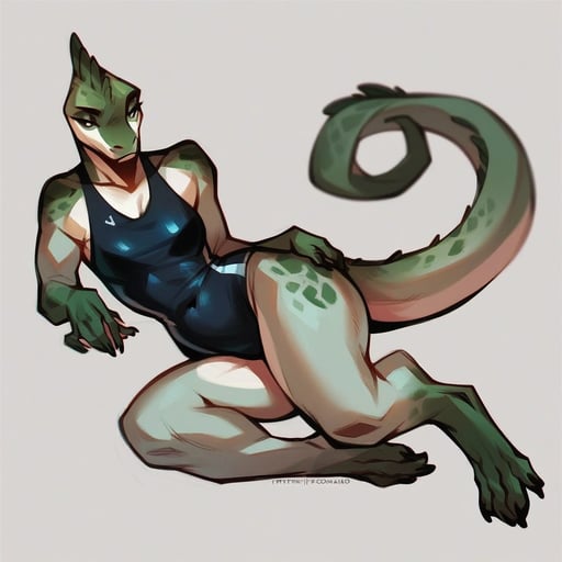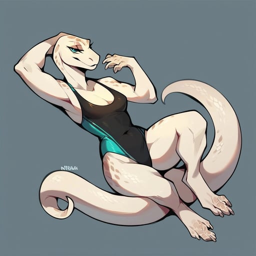 (score_9), simple background, lizard, female reptile, digitigrade anthro, robot, android, solo, looking at you, lying on her back, slim, (white body), tight swimsuit, absolute cleavage, wide hips, thick thighs, buttcrack, bedroom eyes, presenting, belly button, piercing, scales, absurd resolution