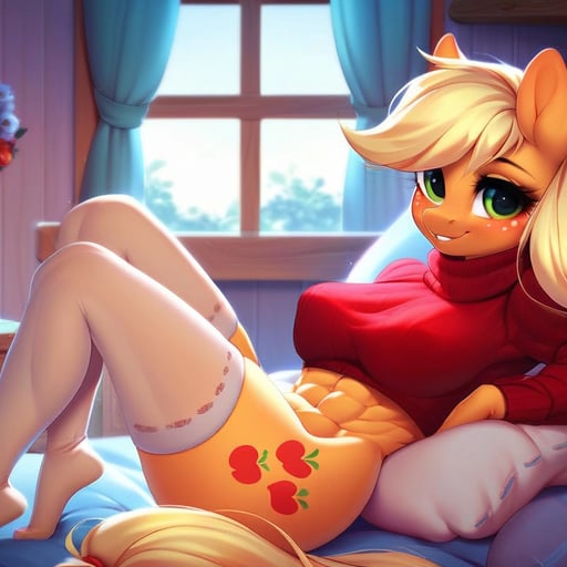 (score_9), Applejack, solo, anthro pony, female, sitting, blushing, bedroom eyes, adorasexy, detailed cute face, thunder thighs, massive muscles, off shoulders, sweater, tight panties, indoors