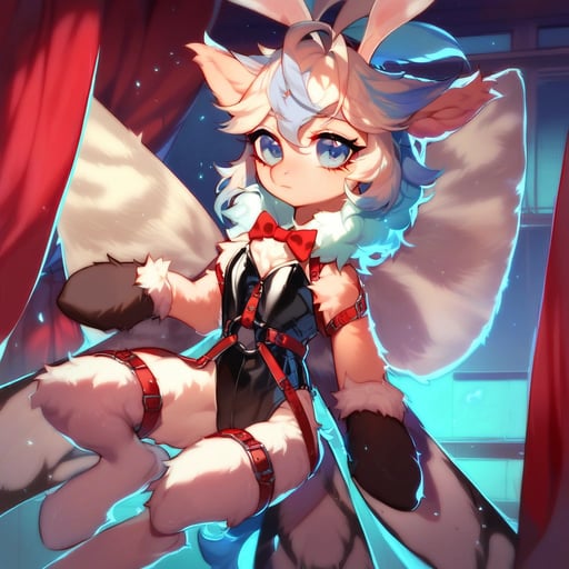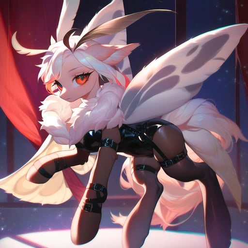 score_9, pony, pony moth hybrid, moth antenna, moth wings, moth pony, solo, adorasexy, cute, fluffy hair, feral, cyberpunk, playboy bunny outfit, leotard, beautiful eyes, stockings, harness, straps, belts, slim, beautiful face, multi tone hair, feathered hair, confused, inside, red curtains, on stage, pouches, saddlebags, bags, alluring pose, fluffy ears, beautiful, pretty, absurd resolution, absurd detail, detailed background