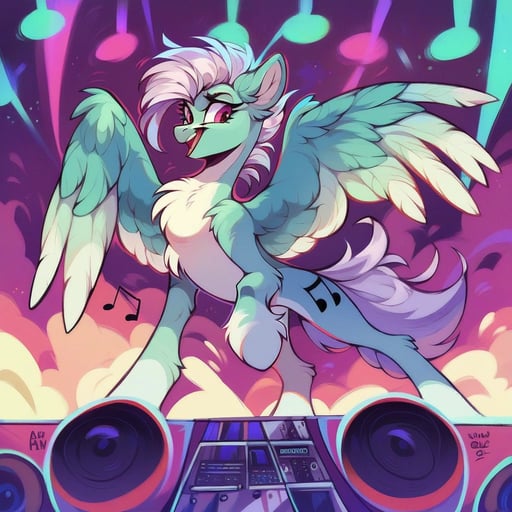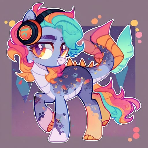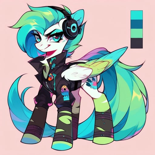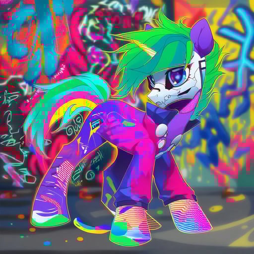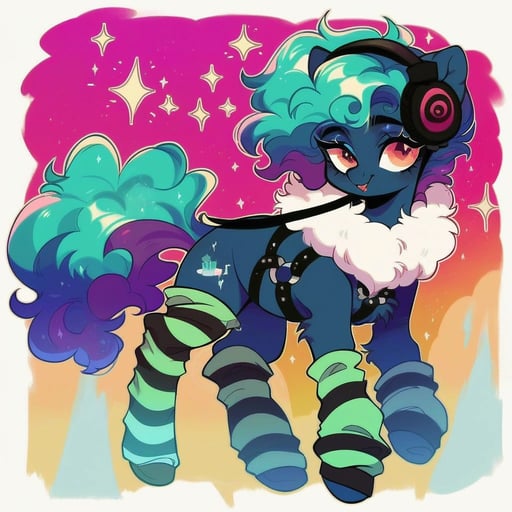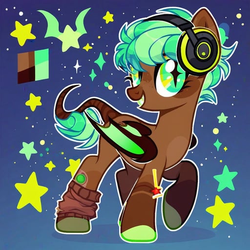 score_9, (rating_safe), alien pony, alien, hybrid, neon, purple body, green hooves, rave aesthetic, alien antenna, black and purple socks, green glow stick necklace, headphones, purple mullet, green highlights, green eyes, fangs, MLP, my little pony, 2d base, genhin impact style